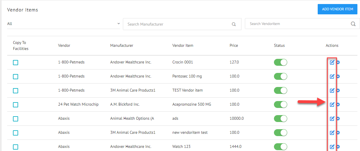 Step 2 : Search for the vendor item and click on the edit button against the item.