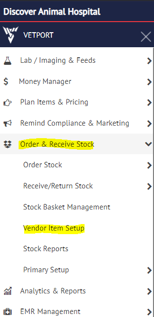 Step 1 : Click on order and receive stock, then on Vendor Item setup.